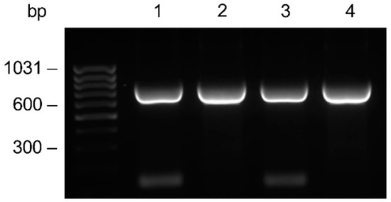 From the anti-HSV-2 original plasmid, in which the genes encoding the monoclonal antibody light and heavy chains had been previously cloned, the LC gene was subcloned into the pComb3/TIG vector. Subsequently, the PCR amplifications of the HC gene with the addition of a four Histidine tag at the C-terminal end was accomplished. The amplifications performed with the specific primer for the His tag addition showed no difference compared to those with the unmodified primer (Figure 2). The HC was cloned into the LC containing vector, resulting in the anti-HSV-2 pComb3/TIG-LC-HCHIS vector verified by restriction analysis; positive clones were identified.
