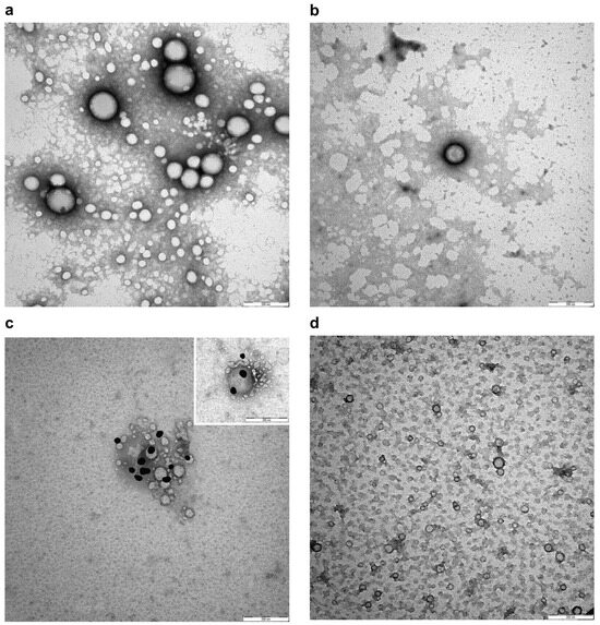 Transmission electron microscopy (TEM) was used to obtain a direct visualization of the nanoparticles with high resolution. When TEM is applied to visualize nanoparticles, a treatment of negative staining is necessary to describe the ultrastructure and potential alterations. As shown in Figure 4a,b, NPs and NIPs had a spherical shape and size heterogeneity. No changes in nanoparticle conformation, alteration of membrane curvature, or formation of roughening or surface ruptures were observed in NIPs compared to NPs. Moreover, an anti-Fab antibody labelled with gold particles was used in order to recognize the available epitopes of the anti-HSV-2 Fab, and used as a specific ligand to functionalize the PLGA-PEG-Mono-Sulfone NPs. Figure 4c shows a magnification depicting this interaction. Gold particles were found on the surface of NIPs, revealing the expression of the targeting ligand. As expected, the staining was not observed on the surface of NPs or in negative controls (Figure 4d).