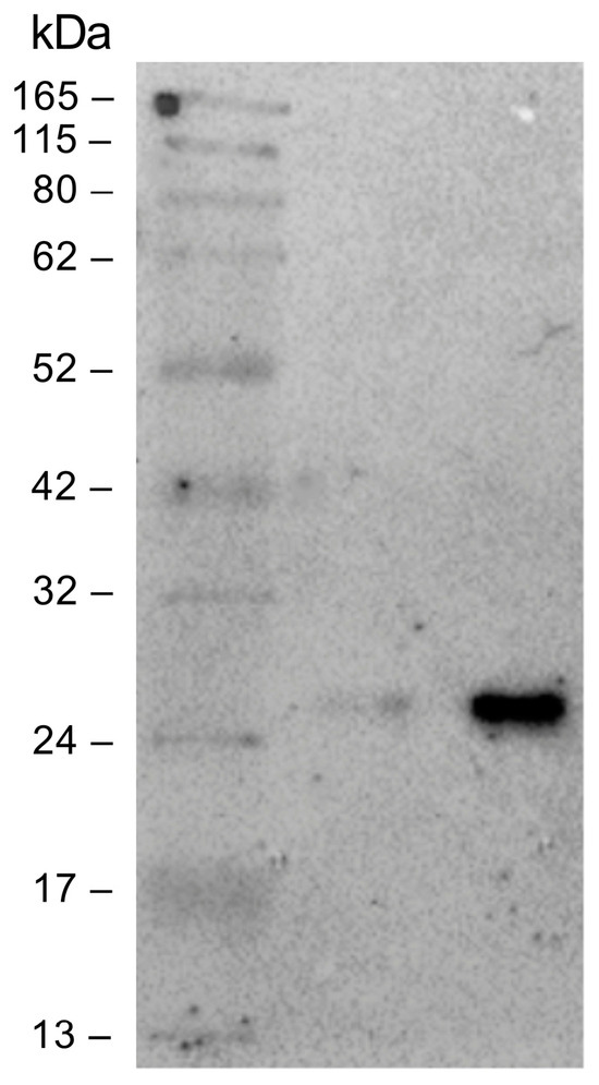 Immunoblot of the PES membranes that flowed through the solution (FT) and the free anti-HSV-2 Fab. The samples were separated by SDS-PAGE under reducing conditions and then transferred to the nitrocellulose membrane. From left to right: marker, unbound Fab, free anti-HSV-2 Fab (C: 1 µM).