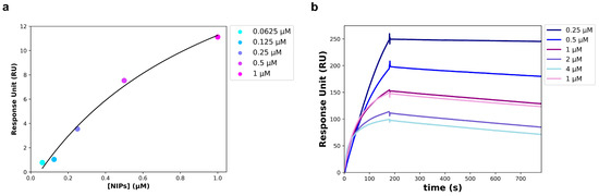 The interactions between the commercial recombinant gG2 glycoprotein (ligand) and the His-tagged anti-HSV-2 Fab or the functionalized NIPs (analytes), were measured using the Surface Plasmon Resonance (SPR) technique using a Biacore X100 instrument (Biacore, Uppsala, Sweden). The gG2 ligand was immobilized on a Sensor Chip CM7 (Biacore AB, Uppsala, Sweden) at 50 µg/mL. The immobilization was obtained via amine coupling (with EDC/NHS solutions) in accordance with the instructions of the manufacturer. In this process, the carboxyl groups on the CM7 chip are first activated with EDC (1-ethyl-3-(3-dimethylaminopropyl) carbodiimide) and NHS (N-hydroxysuccinimide). The protein is then introduced to the activated chip, allowing the amine groups to form a covalent bond with the chip. After immobilization, any remaining reactive NHS esters on the chip surface are deactivated using a solution of ethanolamine. This prevents nonspecific binding during the SPR analysis. Following the immobilization process, affinity analysis is performed. PBS 1X (containing 10 mM phosphate buffer pH 7.4, 0.137 M NaCl and 2.5 mM KCl) was filtrated and used as a running buffer and the binding experiments were performed with a flow rate of 30 µL/min at 25 °C; the association phase was monitored for 180 s, while dissociation was monitored for 300 s. The concentrations analyzed in the SPR assay for both the analytes refer to the concentration of the Fab species and were obtained by successive dilutions, halving the concentration in each step starting from 4 µM (i.e., 200 µg/mL) for the Fab alone and 1 µM of Fab equivalent for the NIPs. Each experiment was carried out using a minimum of five different analyte concentrations, and to verify the reproducibility of data, at least one concentration was repeated in duplicate. The regeneration of the chip surface was achieved by the addition of 2 M NaCl for 30 s before the start of each new cycle. Subsequently, regeneration was performed using a Glycine-HCl buffer (0.1 M, pH 2.5) at the end of the analysis. When the experimental data met the quality criteria, data were analyzed using the Biacore X100 Evaluation Software 2.0.1 plus package. An affinity steady state model was applied to fit the data, as kinetic parameters were out of the range measured by the instrument, but an equilibrium signal of interaction was clearly detected. Therefore, a specific KD was determined with a confidence interval associated with a standard error value to avoid any bias.