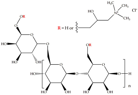 Chemical modifications of polysaccharides can introduce additional functionalities. Cationic guar gum (CGG) is a modified form of guar gum where hydroxyl groups are replaced with hydroxypropyltrimonium groups [16] (Figure 1). A quaternary ammonium functional group gives a positive charge to the polymer, improving its properties as a thickener and enhancer of viscosity and volume. Furthermore, a positive charge-related property may represent a potential interaction with the cell surface of possible pathogens present in infected wounds, enhancing the destruction of the integrity of the microorganisms’ cell membranes. Additionally, CGG has a superior solubility and thermal stability compared to guar gum, and the use of cationic polymers for the development of pharmaceutical preparations for cutaneous use may be interesting to increase the formulations’ bioadhesion to the skin, increasing the duration of stay at the site of application [7,16,17].