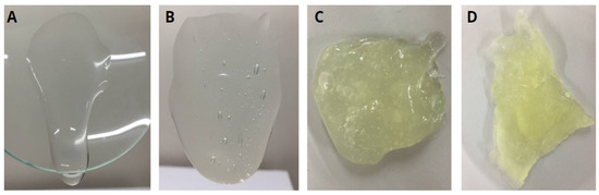 Macroscopic appearance of hydrogels during development formulation tests at different concentrations of CGG. Hydrogels at 1% (A); 2% (B); 3% (C); and 6% (D) w/w of CGG.