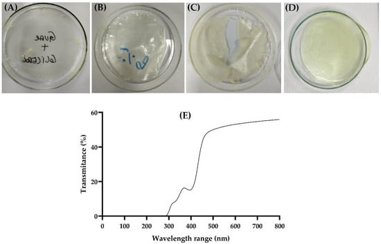 Images of films prepared with 1% (A), 2% (B), 4% (C), and 6% (D) (w/v) CGG during development tests and scans obtained in UV-Vis spectrum to F-CGG (6% w/v) (E).