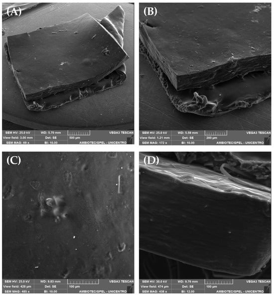 Figure 5 displays the images obtained by SEM microscopy from F-CGG. As can be observed, the surface of F-CGG was uniform with minimal irregularities and no porosity (Figure 5A–C). The cross-section shows a dense and compact morphology, similar to those already reported for other films made of CGG (Figure 5D) [44,50]. The uniformity and dense appearance may be due to hydrogen bonds between the polymer chains, bringing them together in a cohesive and stable fashion [50].