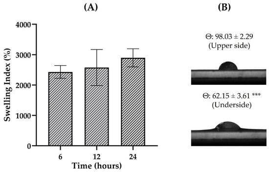 Swelling index (A) and representative images of contact angle (B) determination evaluated for F-CGG (n = 3). The results are expressed as mean ± SD (n = 3). Unpaired t-test. p < 0.001 (***): significant difference between the contact angle obtained on the upper and lower faces of the F-CGG.