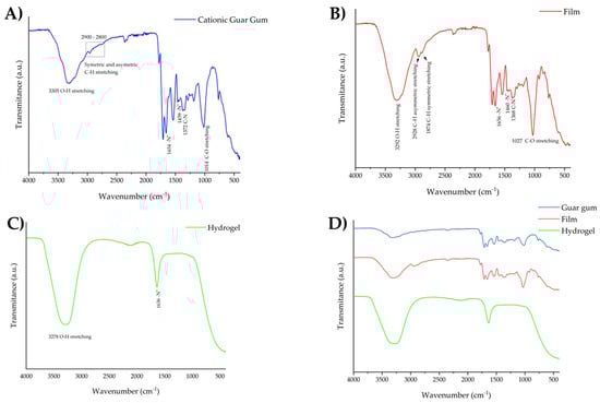 Figure 6 depicts the spectra recorded for the formulations (hydrogel and film) and guar gum. For bulk CGG (Figure 7A), stretching bands of O–H bonds of hydroxyl groups were observed around 3305 cm−1. These bands are characteristic of phenols and carbohydrate monomers, including mannose and galactose [61]. The bands around 2900–2800 cm−1 are due to the asymmetric stretching of the C–H bond of –CH2 groups and the symmetric stretching of C–H of –CH3 groups of the sugar structure, respectively. The band at 1014 cm−1 is ascribed to stretching the C–O bond from –COCH3 groups. The sharp bands at 1654 cm−1 and 1459 cm−1 depict the presence of quaternary ammonium cations. Finally, the band at 1371 cm−1 refers to C–N bonds [44].