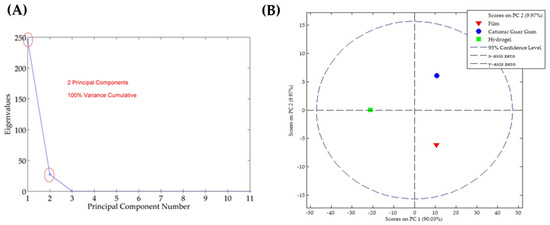 Analyzing chemical changes using ATR-FTIR spectra is complex. With its wide range of wavenumbers (4000–400 cm−1), identifying subtle alterations in the composition can be challenging [25]. In this context, a chemometric model plays a significant role in interpreting spectra and determining the underlying variables. The PCA model serves as an exploratory approach to reducing data dimensionality, pinpointing principal variables and outliers, and facilitating their classification [25,26]. It has been applied in formulation development to understand the interactions between excipients [25,30]. Figure 8A demonstrates that two principal components were found in the ATR-FTIR spectra of the formulations, which were selected using the eigenvalue criterion. After applying the pre-processing smoothing and GLSW, it was possible to observe that these two components are responsible for 100% of the cumulative variance in the data. As observed in the ATR-FTIR spectra, the score graph shows that the CGG and film formulation have chemical similarities once they are in the same plan of PC1, which is responsible for 90.03% of the cumulative variance (Figure 8B). On the other hand, the HG is chemically dissimilar to the F-CGG, which could be due to the preservative and higher water content.