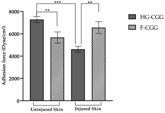 Bioadhesive strength of HG-CGG and F-CGG in uninjured and injured skin. Mean ± SD (n = 3). One-way ANOVA followed by Tukey’s test: (***) difference between HG-CGG in uninjured and injured skin (p < 0.001); (**) difference between HG-CGG and F-CGG in both uninjured and injured skin (p < 0.05).