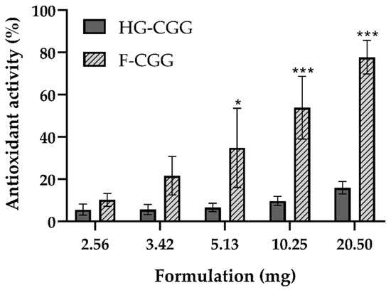 The antioxidant activity of the formulations was tested using ABTS+ (Figure 10). Overall, F-CGG presented superior antioxidant action to HG-CGG, mainly when higher quantities of the forms were tested (5.13, 10.25, and 20.50 mg/mL; p < 0.05). This finding may be related to the superior CGG concentration in the solid formulation. The higher CGG concentration in the F-CGG formulation likely contributes to its increased efficacy in neutralizing free radicals, a critical factor in wound healing and tissue regeneration. The antioxidant properties can be crucial in reducing oxidative stress at the wound site, promoting faster and more efficient healing. Natural gums have desirable properties, including antioxidant activity [64], which was previously assigned to the presence of oligomers in their chemical structure [63,65]. This superiority is likely due to the inherent antioxidant properties of natural gums, which are beneficial for wound-healing applications. The hydroxyl and quaternary ammonium groups on the CGG chains exhibit inherent antioxidant properties, enabling the regulation of the inflammatory response [66]. This characteristic, coupled with the biocompatibility and biodegradability of CGG, makes F-CGG a promising candidate for advanced wound care solutions.