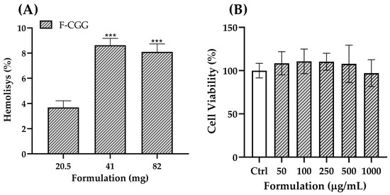 L-929 cells were kept in culture conditions, 37 °C and 5% CO2 (Cell incubator MCO-17 0ACL-PA model; PHC Corporation, Moriguchi, Japan), in Dulbecco’s modified Eagle’s medium (DMEM) supplemented with 10% fetal bovine serum (FBS) and 1% penicillin and streptomycin (10,000 U and 10 mg/mL, respectively). Following this, the cells (1 × 105 cells/mL, equivalent to 1 × 104 cells/well) were seeded in 96-well plates and treated with the F-CGG dispersed in the medium (50–1000 µg/mL of the formulation, corresponding to 27–547 µg/mL of CGG). The medium was used as a negative control. After 24 h under culture conditions, the medium was replaced with 100 µL of MTT solution (0.5 mg/mL in medium) and returned to culture conditions for 3 h. The medium was removed, and the formazan crystals were solubilized in 100 µL of DMSO (dimethyl sulfoxide). The absorbance was read at 570 nm (Cytation 5; Biotek, Winooski, VT, USA). Cell viability was calculated concerning the negative control and expressed as a viability percentage. The assay was performed in triplicate both intra- and inter-experimentally.