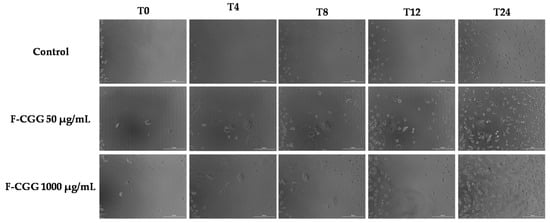 The L-929 cells (5 × 105 cells/mL) were seeded in a 96-well plate and kept in culture conditions for 24 h for confluency. Afterward, the monolayer was disrupted using a 200 µL micropipette tip. The medium was removed, the wells were washed with PBS, and then they were treated with the F-CGG dispersed in DMEM (50 and 1000 µg of the formulation). A negative control was used for DMEM. Images were acquired immediately after treatment (T0) and every 4 h for 24 h (T4, T8, T12, and T24) in the phase contrast mode at ×10 (Cytation 5; Biotek, Winooski, VT, USA). The assay was performed in triplicate.