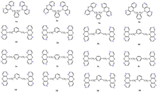 The aim of this work was to investigate the lipophilicity of new dipyridithiazine dimers (1a,b,c,d–4a,b,c,d,) determined experimentally by the RP-TLC method and using calculated computer programs to determine the ADMET parameters and to search for the relationship between their lipophilicity, structure and biological activity. Lipophilicity studies were conducted with the hope of gaining deeper insight into differences in biological activity. The structure of the sixteen tested compounds (1a,b,c,d–4a,b,c,d) is shown in Figure 1.