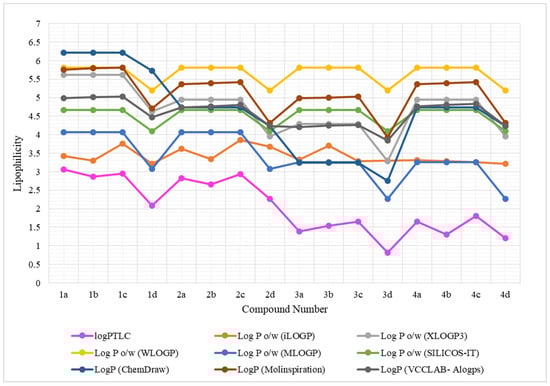 Using the calibration curve equation, the relative lipophilicity parameter RM0 was converted into absolute logP values, which are listed in Table 4. They are in the range of 0.81–3.06 (Table 4). Dimer 3d has the lowest parameter and the highest parameter has the derivative 1a. These values differ significantly from the computer-calculated parameters, which are also shown in Figure 3.