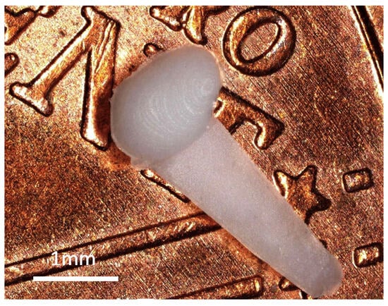 RNIs containing 10% DEX were designed and manufactured as previously described [41]. In short, the dimensions of the round window niche part of the implant were ~1.30 mm × 0.95 mm × 0.60 mm and were equipped with a handle (~3.00 mm × 1.00 mm × 0.30 mm; Figure 2). Medical-grade silicone elastomer MED-4244 (NuSil Technology LLC, Radnor, PA, USA) containing 10 wt% DEX (base, powder, CAS-Nr. 50-02-2, Sanofi SA, Paris, France) was used. MED-4244 is a low-consistency, pourable, and translucent silicone elastomer composed of a silicone base (part A) and a curing agent (part B), which are mixed in a 10:1 weight ratio. The elastomer cures with heat via addition-cure chemistry. The silicone-DEX mixture was provided by MedEl Corp., Austria. It is already used in pre-clinical studies investigating DEX eluting cochlear implants [42]. The silicone-DEX mixture was injected into a mold using the micro injection molding machine formicaPlast (Klöckner DESMA Elastomertechnik GmbH, Achim, Germany). The mold was 3D-printed via the high-resolution printer Asiga Pro 4K45 (Asiga, Alexandria, Australia) using resin Asiga PlasGRAY V2 (Asiga, Alexandria, Australia).