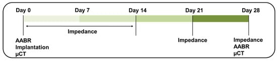 On day 0, the frequency-specific hearing thresholds of guinea pigs were initially assessed. Only guinea pigs exhibiting normal hearing thresholds were considered eligible for inclusion in the experiments. Subsequent to surgical interventions, a micro-computed tomography (µCT) scan was employed to verify the positions of the CI or the success of RNI insertion. Impedance measurements were conducted on day 0 post-operation and on days 1 through 14, as well as on day 21 and day 28, without anesthesia. Additionally, on day 28, the frequency-specific hearing thresholds were measured, and µCT scans were performed to assess the position of the CI and RNI. Subsequently, the guinea pigs were euthanized, and the cochleae were harvested for histological examination (Figure 3).
