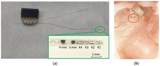 (a) Cochlear implant for guinea pig. The green box shows an enlarged view of the electrode array tip, with the positions of two black markers and the four platinum contacts marked, respectively. (b) Image of a cochlea with a focus on the basal region 28 days after implantation. The inserted RNI (green rectangle) and CI (red circle) are visible. The RNI was placed in the RWN while the CI was inserted in a cochleostomy 2 mm below the round window. The black marker illustrating a 4 mm distance from the electrode tip is visible. The electrode is cut for better handling and reduction of the danger of explantation during the process of tissue harvesting.