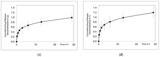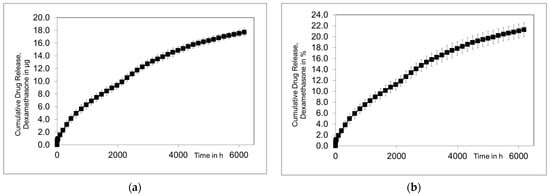 The mean (±SD) of masses of the RNIs was 0.83 ± 0.02 mg. Based on the mean mass, the calculated mean DEX amount in the samples before incubation was 83.3 ± 2.5 µg (Table 2). The supernatant was sampled until 6000 h, i.e., 250 days, or 35 weeks, after the start of the incubation. The analysis still showed a measurable release at that time point. Therefore, the incubation was still running, and we report the data of the 250-day sampling period here (Figure 5). Data are reported as a cumulative release over time (Figure 5a) and released in relation to the amount of DEX at the time of manufacturing (Figure 5b). The release showed a two-phased progression. A burst release occurred within the first 29 h, during which a relatively large amount of DEX (ca. 1 µg in total) was released rather quickly (Figure 5c,d). This was followed by a phase in which the release tapers off. A release rate of about 0.6 µg/week was observed from the sixth week on; from week 19, the rate decreased to 0.2 µg/week. After 35 weeks, about 21% of the loaded DEX (total amount: 12.8 ± 0.6 µg) was released.
