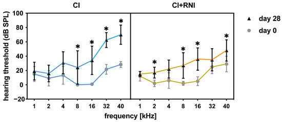 The frequency-specific hearing thresholds in the CI and CI + RNI groups on days 0 and 28 are depicted. A comparison between day 0 and day 28 reveals significant differences in the CI group at 8, 16, 32, and 40 kHz, while the CI + RNI group exhibits significant differences at 2, 8, 16, and 40 kHz. (* p < 0.05).