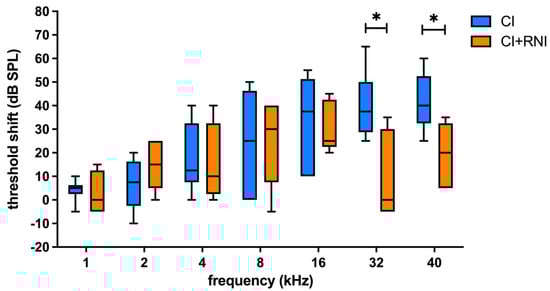 The frequency-specific threshold shifts (threshold change from day 0 to day 28) of the CI group and CI + RNI groups are plotted (median and min to max). Between the CI and CI + RNI groups, there are significant differences in threshold shifts at 32 and 40 kHz, with CI-only resulting in higher shifts. (* p < 0.05).