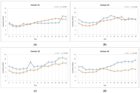Lastly, at contacts K3 and K4 (more basal), the mean impedances in the CI + RNI group were lower compared with the CI group over the 28-day period (Figure 8c,d). At contact K3, the impedance shift in the CI group appeared similar to that of the CI + RNI group. However, at contact K4, the impedance shift was larger in the CI group (3 ± 2.5 kΩ) than in the CI + RNI group (0.3 ± 1.1 kΩ) (Table 4).