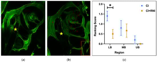 Fibrotic tissue was observed in the basal turn of the cochlea (Figure 9a,b), in none of the cochleae extending toward more apical regions. In the CI group, from the lower basal turn (LB) to the middle basal turn (MB) to the upper basal turn (UB), the fibrosis ranking scores gradually decreased from 1.4 ± 0.35 (LB) to 0.8 ± 0.28 (MB) to 0.32 ± 0.14 (UB). A comparative analysis between the CI group and the CI + RNI group revealed less fibrous tissue growth in the LB in the CI + RNI group (0.5 ± 0.55) compared with the CI group (p < 0.05) and no fibrosis at all in the UB, as depicted in Figure 9c. In the MB and UB, there was no significant difference between the two groups (Figure 9c).