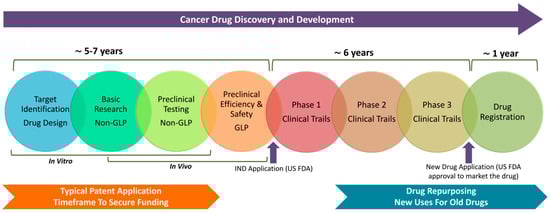 Despite the diverse mechanisms of action presented by unconventional compounds, the current patent system imposes significant limitations on their development as cancer therapeutics. An established exception is called drug repurposing, which permits the application of existing drugs in new therapeutic uses. Drug repurposing (or drug repositioning), involves identifying new indications for drugs already approved for other conditions. This approach substantially reduces the time and cost associated with drug development by utilizing existing data on safety, pharmacokinetics, and side effects. Drug repurposing can expedite the market introduction of treatments, providing new effective cancer therapeutic options. This method is especially valuable in oncology, offering a more rapid and cost-effective development process by leveraging existing data on drug safety, dosage, and toxicity (Figure 1).