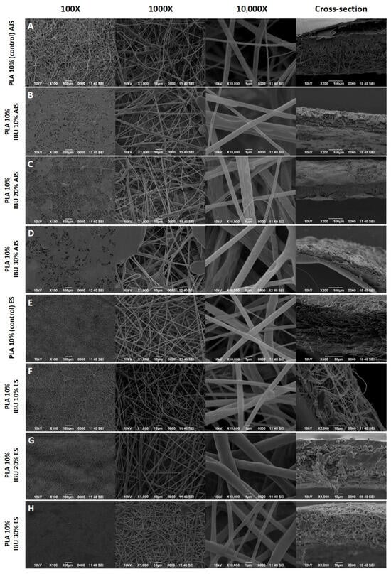 SEM images showing the morphology of PLA 10% scaffolds at 100×, 1000×, and 10,000× and their cross-section. Membranes of (A) 10% PLA (control) and 10% PLA with (B) 10, (C) 20, and (D) 30% Ibuprofen synthesized with the AJS technique are observed. Also, membranes of (E) PLA 10% (control) and PLA 10% with (F) 10, (G) 20, and (H) 30% Ibuprofen synthesized with the ES technique are shown.