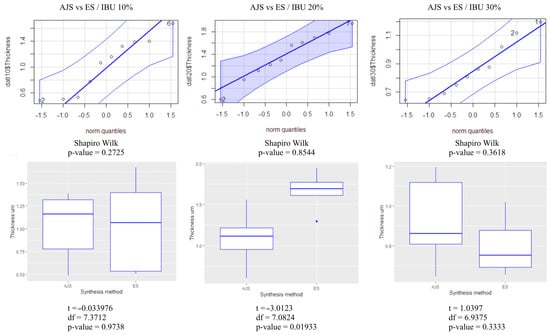 Fiber thickness between the two spinning methods was analyzed using the t-test and box plot analysis (Figure 3), with quantile comparisons (ggplot graphs). The normality of the results was analyzed by the Shapiro-Wilk test. It was determined that the 10% and 30% fiber groups showed no significant difference between the two methods (p > 0.05). However, the 20% fibers rejected the null hypothesis (H0) (p < 0.05), indicating a statistically significant difference between the AJS and ES synthesis methods.