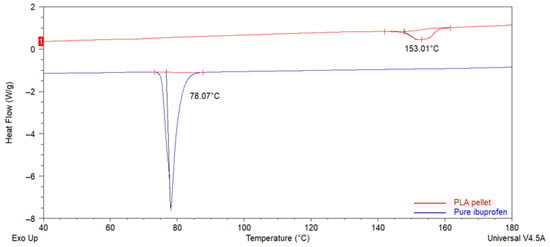 DSC thermograms of the PLA pellet and pure Ibuprofen’s control settings for thermal characterization.