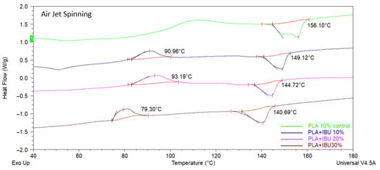 DSC thermograms of the PLA 10% control scaffold and PLA + IBU 10, 20, and 30% scaffolds synthesized by Air Jet Spinning.