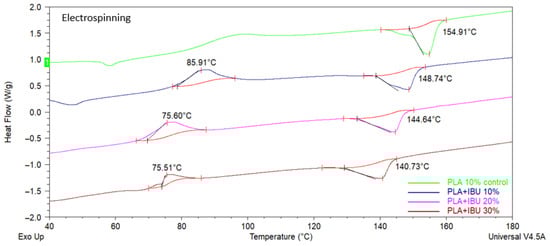 DSC thermograms of the PLA 10% control scaffold and PLA + IBU 10, 20, and 30% scaffolds synthesized by Electrospinning.