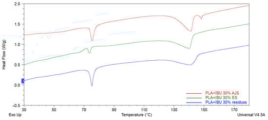 Additionally, DSC thermograms for residuals were evaluated (Figure 7). The results indicate that if IBU and PLA combine only mechanically, the drug maintains its physical form, with apparent visible Tm. This result confirms that both AJS and ES synthesis techniques improved the incorporation of the drug into the polymeric matrix.