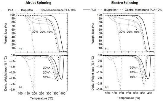 Thermogravimetric analysis (TGA) thermograms of PLA Pellet and Pure Ibuprofen vs. AJS PLA10% + IBU membranes ((A-1) % weight loss and (A-2) DTG curves). PLA Pellet and Pure Ibuprofen vs. ES PLA10% + IBU membranes ((B-1) % weight loss and (B-2) DTG curves).