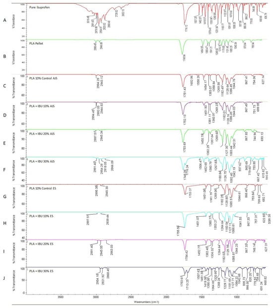 FT-IR Spectroscopy of (A) Pure ibuprofen, (B) PLA pellet, (C) PLA10% control, (D) PLA + IBU 10%, (E) 20%, (F) 30% scaffolds done by Air jet Spinning and (G) PLA10% control, (H) PLA + IBU 10%, (I) 20%, (J) 30% scaffolds done by Electrospinning.