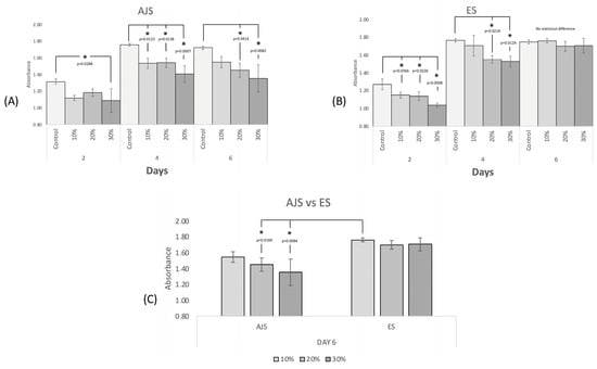 Proliferation of osteoblasts at 2, 4, and 6 days to the exposure of (A) AJS and (B) ES membranes. (C) Comparison of cell proliferation after 6 days of AJS vs. ES. (* Significant statistical difference).