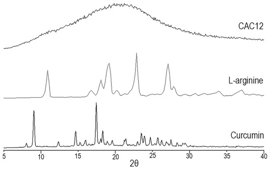 In the powder XRDs of curcumin and L-arginine, diffraction peaks are observed, indicating that the raw materials are crystalline, whereas the powder XRD of CAC12 shows the presence of a diffuse halo without diffraction peaks, which is an indication of the presence of an amorphous solid.