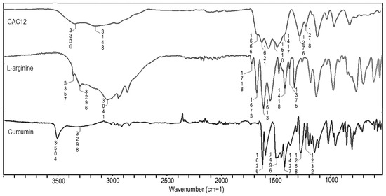 Attenuated total reflectance–Fourier transform infrared (ATR-FTIR) spectra for CAC12, L-arginine and curcumin.