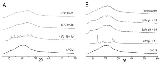 X-ray powder diffractograms acquired from CAC12 stability studies. (A) Powder X-ray diffractograms of CAC12 obtained after 1 month of storage under several temperature and relative humidity (RH) conditions. (B) Powder X-ray diffractograms of CAC12 obtained after 12 h in distilled water, phosphate buffer (pH = 6.8), acetate buffer (pH = 4.5) or HCl solution (pH = 1.2).