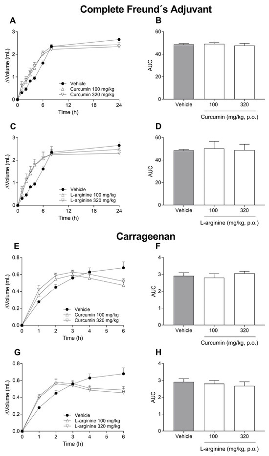Lack of anti-inflammatory effect of oral curcumin and L-arginine in Freund’s complete adjuvant or carrageenan models. Time courses show the effects of increasing doses (100–320 mg/kg) of curcumin and L-arginine on inflammation induced by Freund’s complete adjuvant (A,C) or carrageenan (E,G). The bar graphs show a lack of anti-inflammatory effect of increasing doses of curcumin and L-arginine in Freund’s complete adjuvant (B,D) or carrageenan (F,H) models. Curcumin and L-arginine were orally administered at −1 h with respect to intra-articular injection of Freund’s complete adjuvant (100 µL, 0.1%) or subcutaneous administration of carrageenan (50 µL, 1%). Data are expressed as the mean ± S.E.M. of 6 animals per experimental group. There was no statistical difference based on one-way ANOVA. The area under the curve (AUC) was calculated from the time courses using the trapezoidal rule.
