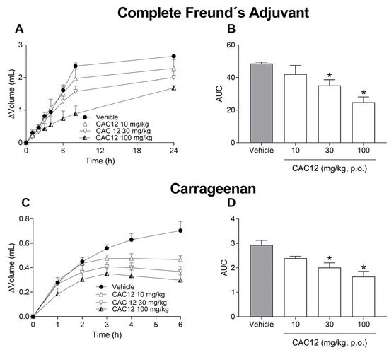 Anti-inflammatory effects of oral CAC12 (1:2) in Freund’s complete adjuvant or carrageenan models. Time courses show the effects of increasing doses (10–100 mg/kg) of CAC12 on inflammation induced by Freund’s complete adjuvant (A) or carrageenan (C). The bar graphs show the anti-inflammatory effect produced by increasing doses of CAC12 in Freund’s complete adjuvant (B) or carrageenan (D) models. Curcumin and L-arginine were orally administered at −1 h with respect to intra-articular injection of Freund’s complete adjuvant (100 µL, 0.1%) or subcutaneous administration of carrageenan (50 µL, 1%). Data are expressed as the mean ± S.E.M. of 6 animals per experimental group. * Statistically different from the vehicle based on one-way ANOVA followed by Dunnett’s test with p < 0.05. Statistical differences in time courses were omitted for the sake of clarity. The area under the curve (AUC) was calculated from the time courses using the trapezoidal rule.