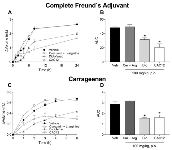 Effect of oral administration of 100 mg/kg of the crystalline mixture of curcumin (Cur, 51.4 mg) + L-arginine (Arg, 48.6 mg), diclofenac (Dic) and CAC12 (Co-amorph, 1:2) on inflammation induced by Freund’s complete adjuvant or carrageenan. The time courses show the anti-inflammatory effect produced by 100 mg/kg of diclofenac and CAC12 on the inflammation induced by Freund’s complete adjuvant (A) and carrageenan (C). The bar graphs indicate that 100 mg/kg of diclofenac and CAC12, but not the curcumin + L-arginine combination, have anti-inflammatory effects in Freund’s complete adjuvant (B) and carrageenan (D) models. Data are expressed as the mean ± S.E.M. of 6 animals per experimental group. * Statistically different from the vehicle group (Veh) based on one-way ANOVA followed by Tukey’s test with p < 0.05. Statistical differences in time courses were omitted for the sake of clarity. The area under the curve (AUC) was calculated from the time courses using the trapezoidal rule.