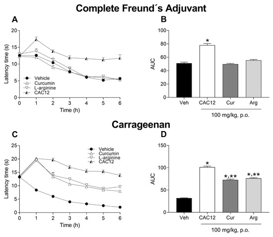 To compare the antihyperalgesic effects of single oral doses of CAC12 (100 mg/kg), curcumin (100 mg/kg) and L-arginine (100 mg/kg), we used CFA- and carrageenan-induced thermal hyperalgesia animal models. In the CFA-induced thermal hyperalgesia model, only the oral administration of CAC12, not curcumin or L-arginine, significantly increased the latency time with respect to the vehicle group (Figure 9A,B). On the other hand, in the carrageenan-induced thermal hyperalgesia model, curcumin, L-arginine and CAC12 showed antinociceptive effects that were statistically different from the vehicle group; however, the antihyperalgesic effect induced by CAC12 was statistically greater than curcumin or L-arginine (Figure 9C,D).