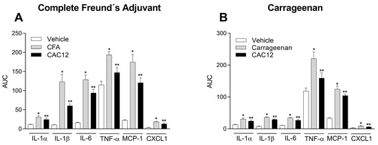 The results indicated that the oral administration of CAC12 was able to decrease the elevation of interleukin 1 alpha (IL-1α), IL-1β, IL-6, tumor necrosis factor-alpha (TNF-α), monocyte chemoattractant protein 1 (MCP-1) and growth-related oncogene/keratinocyte-derived chemokine (GRO/KC), better known as the chemokine CXCL1, in both inflammation models (Figure 10). In addition, CAC12 was unable to modify the levels of IL-2, IL-4, IL-5, IL-7, IL-10, IL-12 (p70), IL-13, IL-17A, IL-18, granulocyte-colony stimulating factor (G-CSF), granulocyte-macrophage colony-stimulating factor (GM-CSF), macrophage colony-stimulating factor (M-CSF), macrophage inflammatory protein-1 alpha (MIP-1α), MIP-3α, regulated upon activation, normal T cell expressed and presumably secreted chemokine (RANTES), interferon-gamma (IFN-ɣ) or vascular endothelial growth factor (VEGF) in any of the models at the tested times. Time courses of cytokines that had a statistical difference are shown in Supplementary Figures S3 and S4.