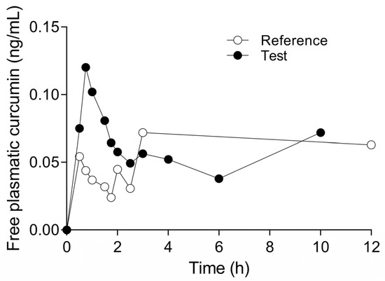In the clinical study, the plasmatic concentrations of free curcumin (ng/mL) and its main metabolites (curcumin glucuronide or curcumin sulfate) were plotted against time (h) to obtain the pharmacokinetic profile and pharmacokinetic parameters (Ke, t1/2, tmax, Cmax, AUC0–24 and AUC0-inf) of each healthy subject. After that, the data were analyzed and presented as the mean ± S.E.M. of 18 healthy subjects per experimental arm. To compare statistical differences in Cmax, AUC0–24 and AUC0-inf between the reference compound and the test compound, a paired Student’s t-test was used.