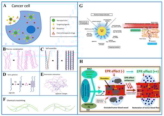 (A) Drug delivery with active targeting on a cancer cell, crosslinking mechanisms. (B) Thermo condensation, (C) Self-assembly, (D) Ionic gelation, (E) Electrostatic interaction, (F) Chemical crosslinking, (G) Various surface-engineered poly(lactic-co-glycolic acid) (PLGA) nanoparticles (NPs) for passive or active tumor targeting. Arg-Gly-Asp (RGD); reticuloendothelial system (RES); transferrin (Tf); vascular endothelial growth factor (VEGF) Reproduced from [71], MDPI, 2019. (H) Graphical abstract of enhanced permeability and retention (EPR) Reproduced from [72], MDPI, 2022.