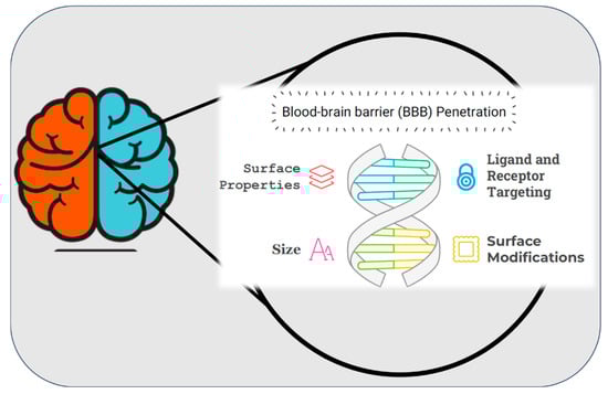 Schematic representation of surface properties, ligand and receptor targeting, and size characteristics of blood brain barrier penetration. “During the preparation of this manuscript, the author(s) used [Napkin AI, beta-0.10.2] for the purposes of [drawing figure]. The authors have reviewed and edited the output and take full responsibility for the content of this publication”.
