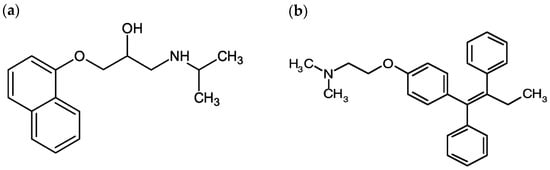 Chemical structure of (a) propranolol (C16H21NO2), and (b) tamoxifen (C26H29NO).
