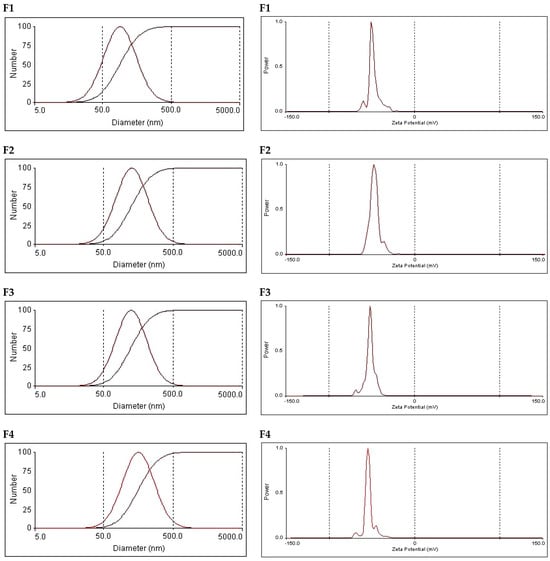 With respect to the zeta potential, all formulations carried a negative charge, with the numerical values of the zeta potential ranging from −48.4 to −54.9 mV (Table 3 and Figure 3). These values guarantee inter-vesicle repulsion, which imparts physical stability. Standard niosomes (F1) revealed a negative zeta potential, which was attributed to the presence of poly oxygen groups, which can polarize in an aqueous dispersion carrying a small negative charge. Other investigators have attributed the recorded negative zeta potential to the preferential adsorption of hydroxyl ions at the vesicular surface []. Similar records of zeta potential were previously reported by other researchers for conventional niosomes comprising Span 60 and cholesterol []. Surprisingly, increasing the bile salt concentration did not lead to a significant change in the zeta potential. This may be attributed to the highly negative nature of bile-salt-containing vesicles. Similar data were recorded by other investigators and were considered to be a positive contributing factor to the physical stability of the vesicles [].