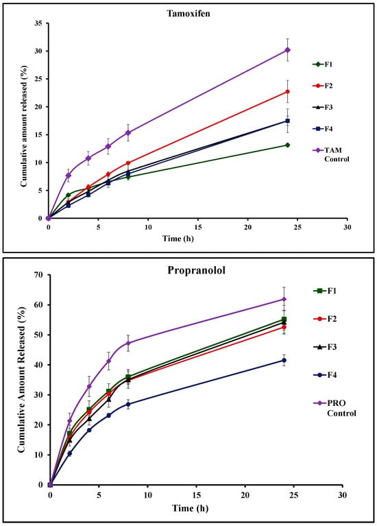 The entrapment efficiency is a determining factor for the feasibility of vesicular carriers for delivery of a given drug. Table 3 presents the calculated entrapment efficiency values of TAM and PRO in the vesicular systems. Regarding TAM, the computed entrapment efficiency values were 87.5%, 97.8%, 95.3%, and 93.5% for standard niosomes (F1) and bilosomes containing bile salts at concentrations of 4, 6, and 8 mg/mL (F2, F3, and F4, respectively). The high entrapment efficiency values correlate with the lipophilic nature of TAM, which dictates its preferential partitioning into the lipidic components of the vesicular lipid bilayer. Localization of lipophilic drugs into the lipid bilayer is documented in the literature []. Similar entrapment efficiency values were recorded for other lipophilic drugs []. For PRO, lower entrapment efficiency was noted, recorded at 45.3%, 43.6%, 46.8%, and 31.0% for formulations F1, F2, F3, and F4, respectively. The relatively lower entrapment compared to TAM is acceptable when taking into account the hydrophilic nature of PRO. Hydrophilic drugs are expected to be located in the aqueous compartments of the vesicles, and the entrapment efficiency will be mainly dependent on the entrapped volume of the aqueous phase, with a possible contribution from the surface adsorption of the drug on the lipid bilayer []. It is noteworthy that bilosomes containing the highest concentration of bile salts showed the lowest entrapment efficiency value of PRO. This is obviously due to the highly fluidizing effect of bile salts, which subsequently allows for the escape of large amounts of the hydrophilic PRO. Low entrapment efficiency was indicated for hydrophilic drugs in earlier literature reports [,].