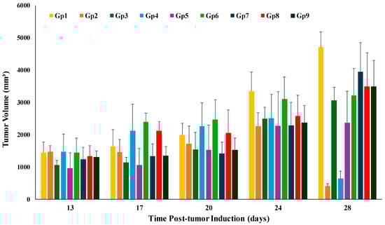 Changes in the tumor volume in the tested animal groups during the experiment’s time course. Gp2, Gp3, Gp4, and Gp5 are the animal groups assigned for oral administration of TAM bilosomes, TAM suspension, TAM/PRO bilosomes, and TAM/PRO suspension, respectively. Gp6, Gp7, Gp8, and Gp9 are the animal groups assigned for intratumor administration of TAM bilosomes, TAM suspension, TAM/PRO bilosomes, and TAM/PRO suspension, respectively. Gp1 represents the untreated animal group.